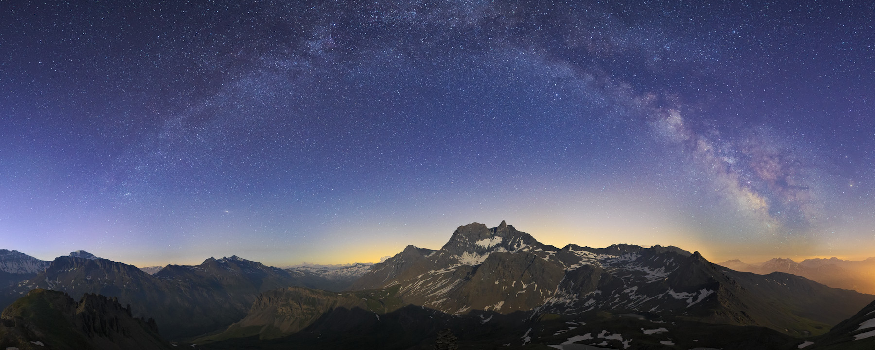 Presto le cime cominciano a tingersi di rosso, il Sole cala dietro le montagne e lascia spazio al chiarore di una falce di Luna che illumina il paesaggio con la sua luce tenue, mentre si fa sempre più visibile l’arco della Via Lattea che attraversa il cielo da orizzonte a orizzonte.